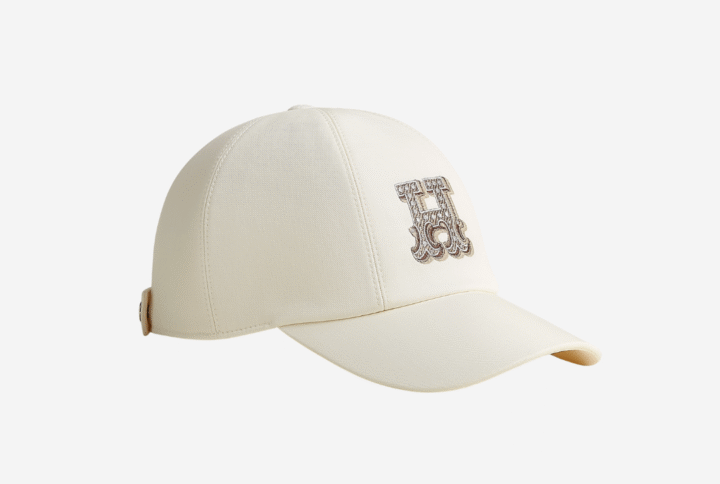 Cap in water-repellent cotton twill with interior “Rider” badge by Ugo Bienvenu and “H Droit” embroidery. Lining in plain cotton and silk. Adjustment tab with two brushed palladium-plated Clou de Selle snap closures.