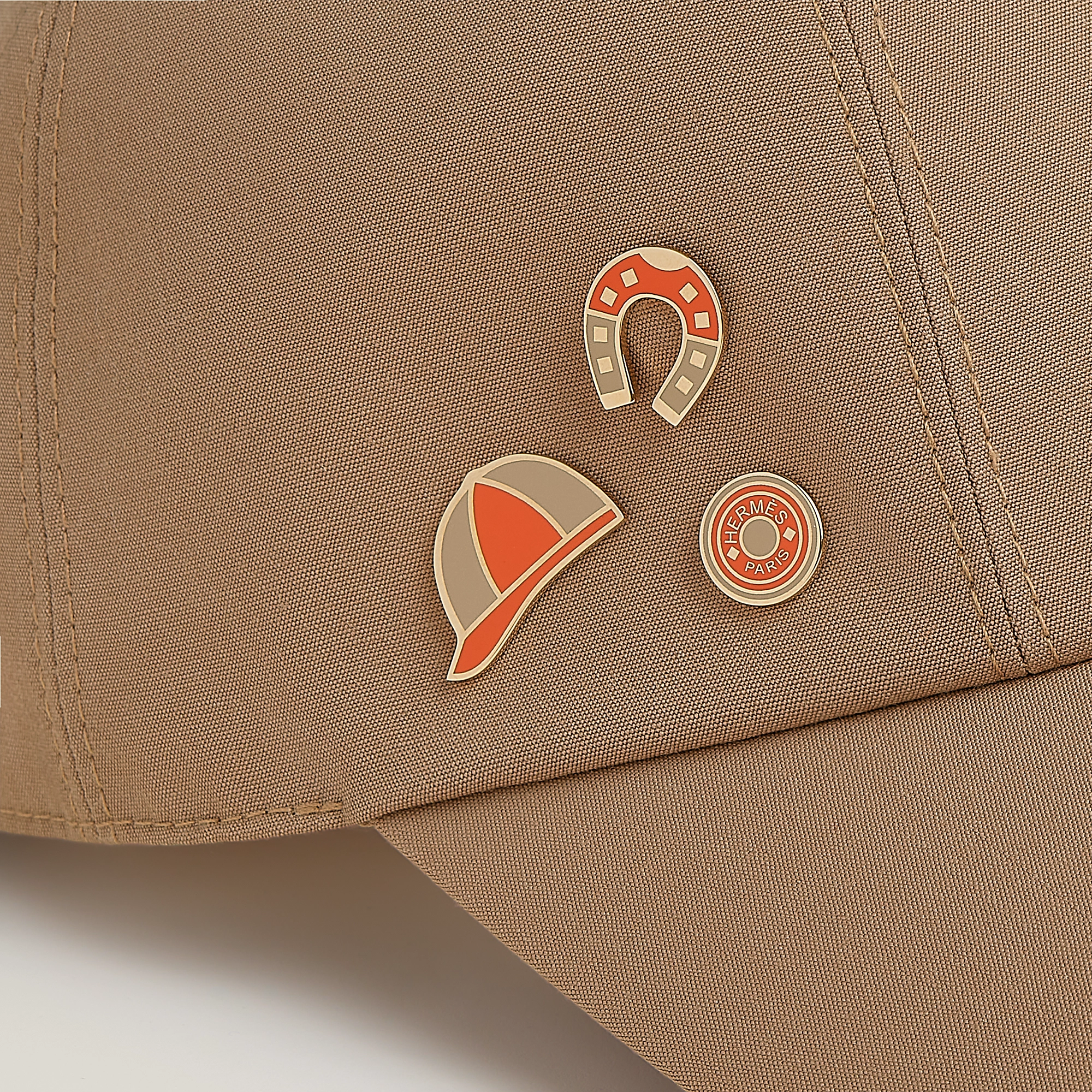 Cap in compact wool poplin with non-removable colored lacquered polished palladium-plated “Clou de Selle”, “Fer a Cheval” and “Bombe d’Equitation” brass fasteners on the side. Lining in “Jump” jacquard cotton and silk. Adjustment tab with two polished palladium-plated Clou de Selle snap closures.
